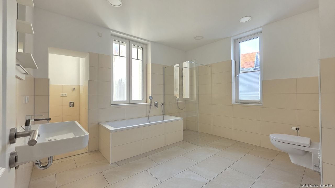 Der Mittelpunkt der Wohnung ist die großzügige Diele, von der Sie alle Räume betreten. Der hochwertige Bodenbelag in warmer Holzoptik erstreckt sich durch alle Wohnräume und schafft eine harmonische Verbindung zwischen den Zimmern. Ein besonderes Highlight ist das exklusive Tageslichtbadezimmer. Es bietet mit einer großzügigen Badewanne für entspannte Abende sowie einer separaten, modernen Dusche für den frischen Start in den Tag höchsten Komfort.