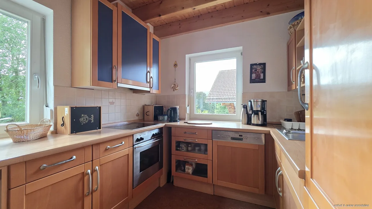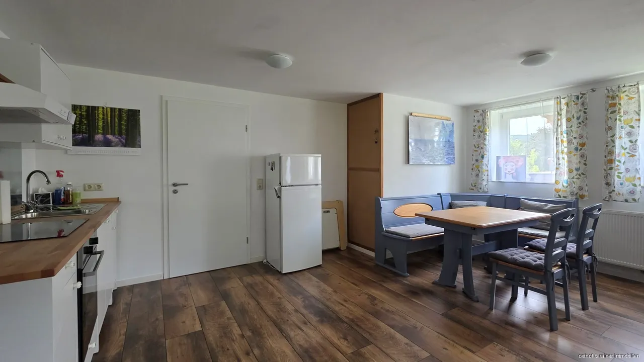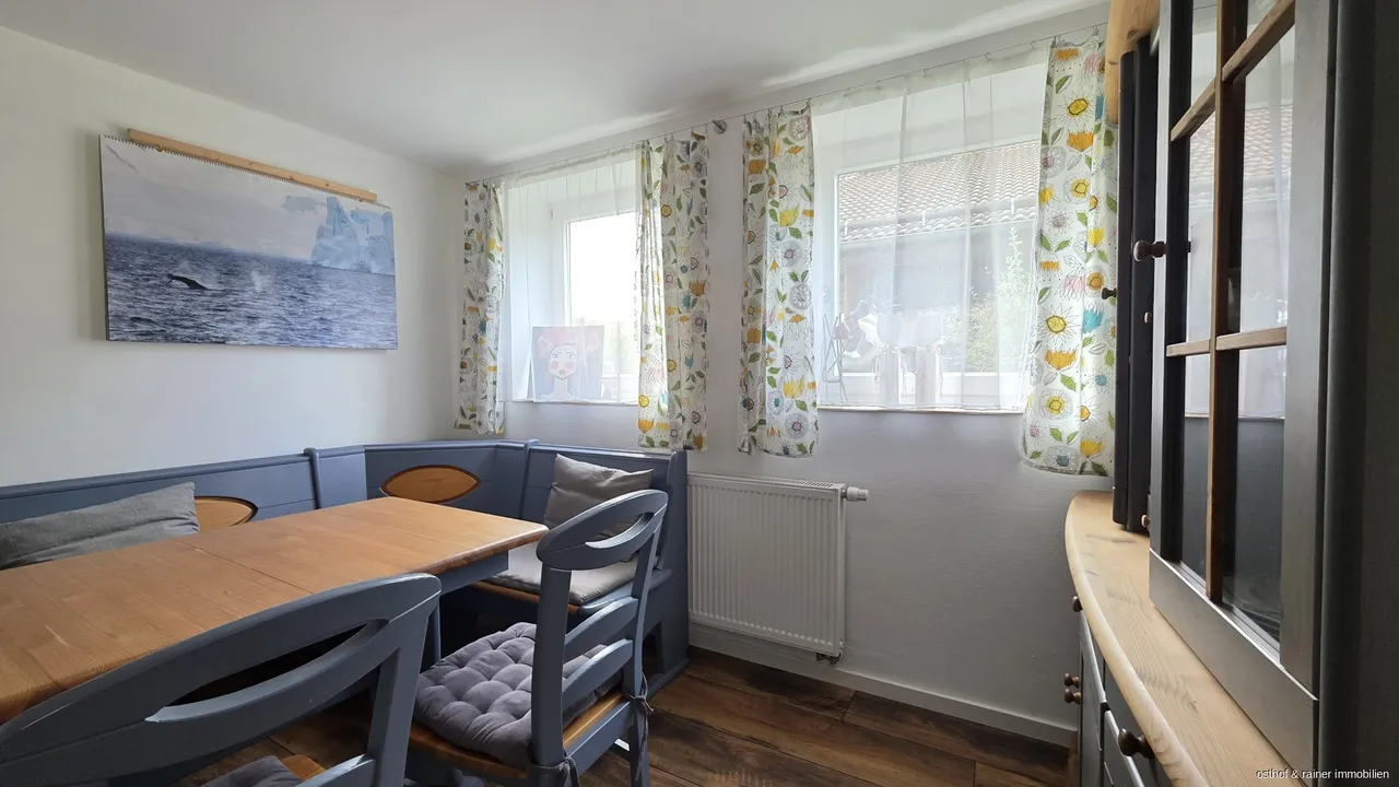 Vom lichtdurchfluteten Wohnzimmer kommen Sie in die offene Küche mit einer gemütlichen Essecke. Rechte Hand gelangen Sie auf die großzügige Veranda, die nach Westen ausgerichtet ist.