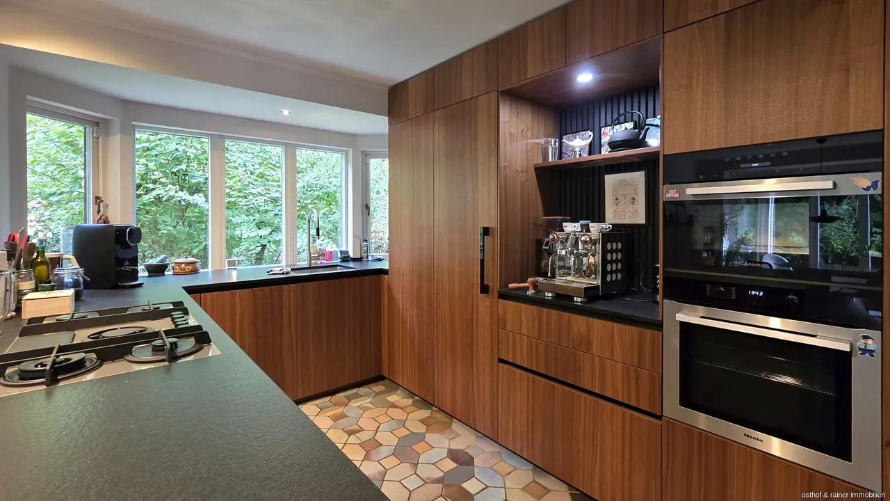 Ein besonderes Highlight ist der eingewachsene Garten, der absolute Privatsphäre bietet – eine grüne Oase zum Entspannen und Genießen. Großzügige Terrassenbereiche schaffen fließende Übergänge zwischen Innen- und Außenraum.