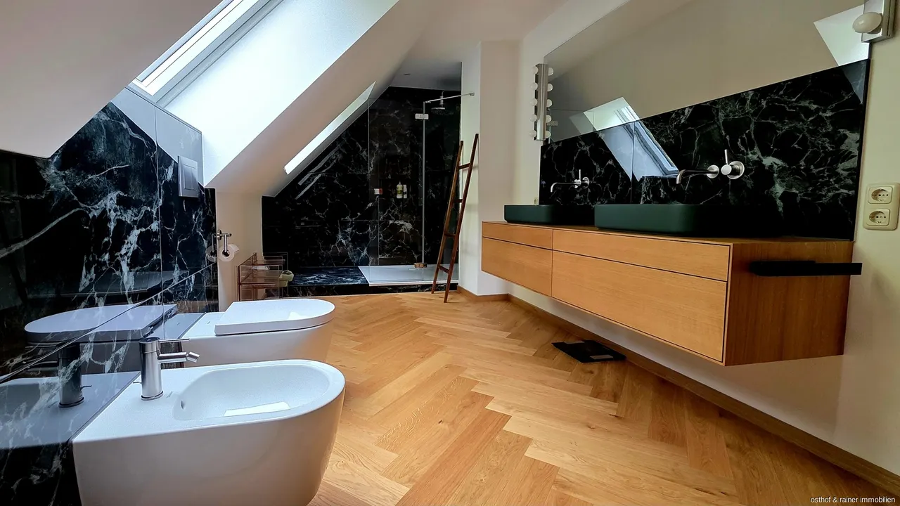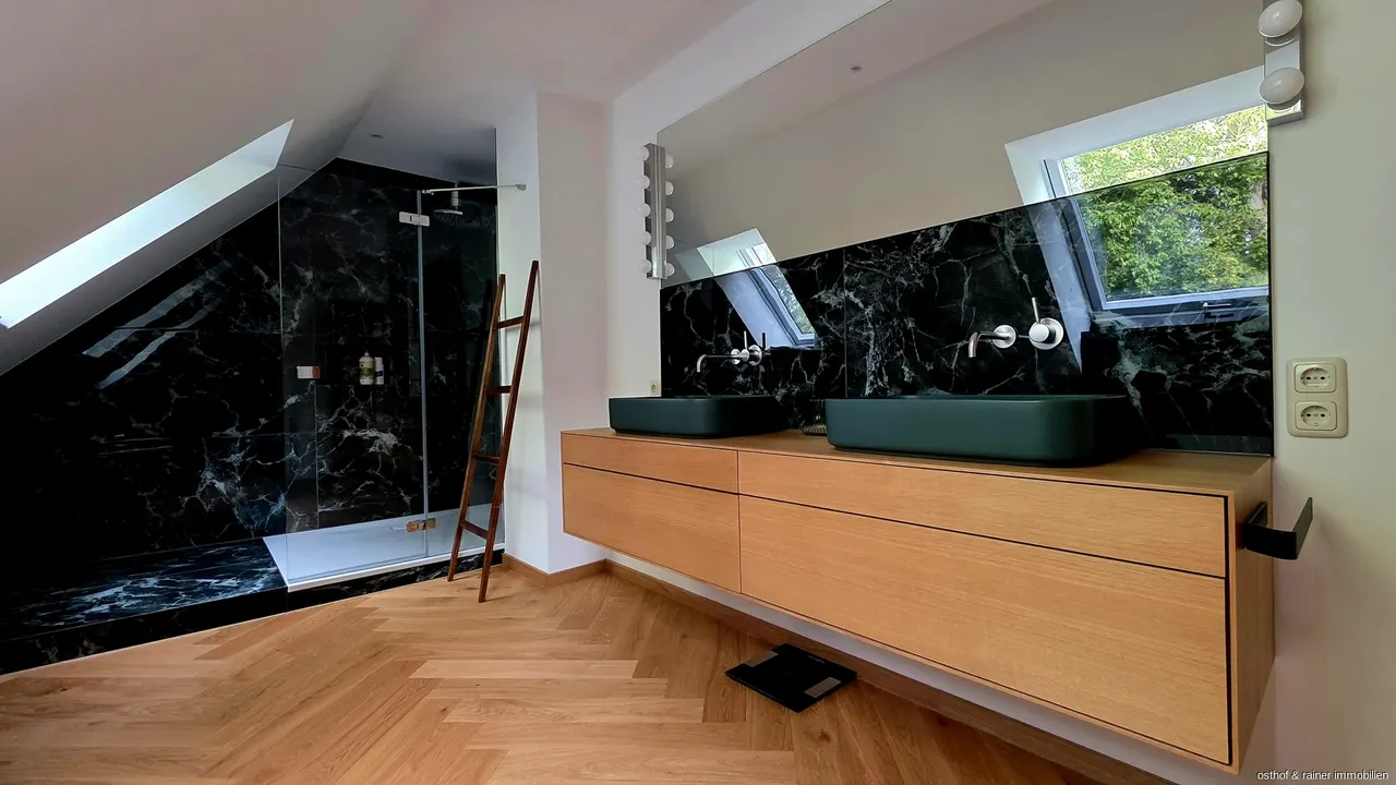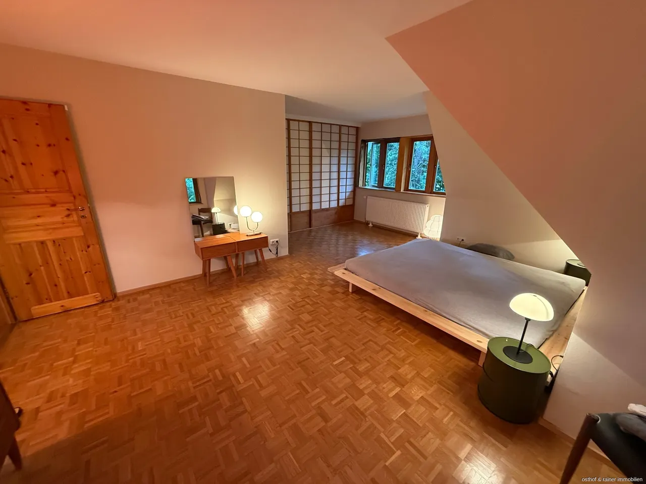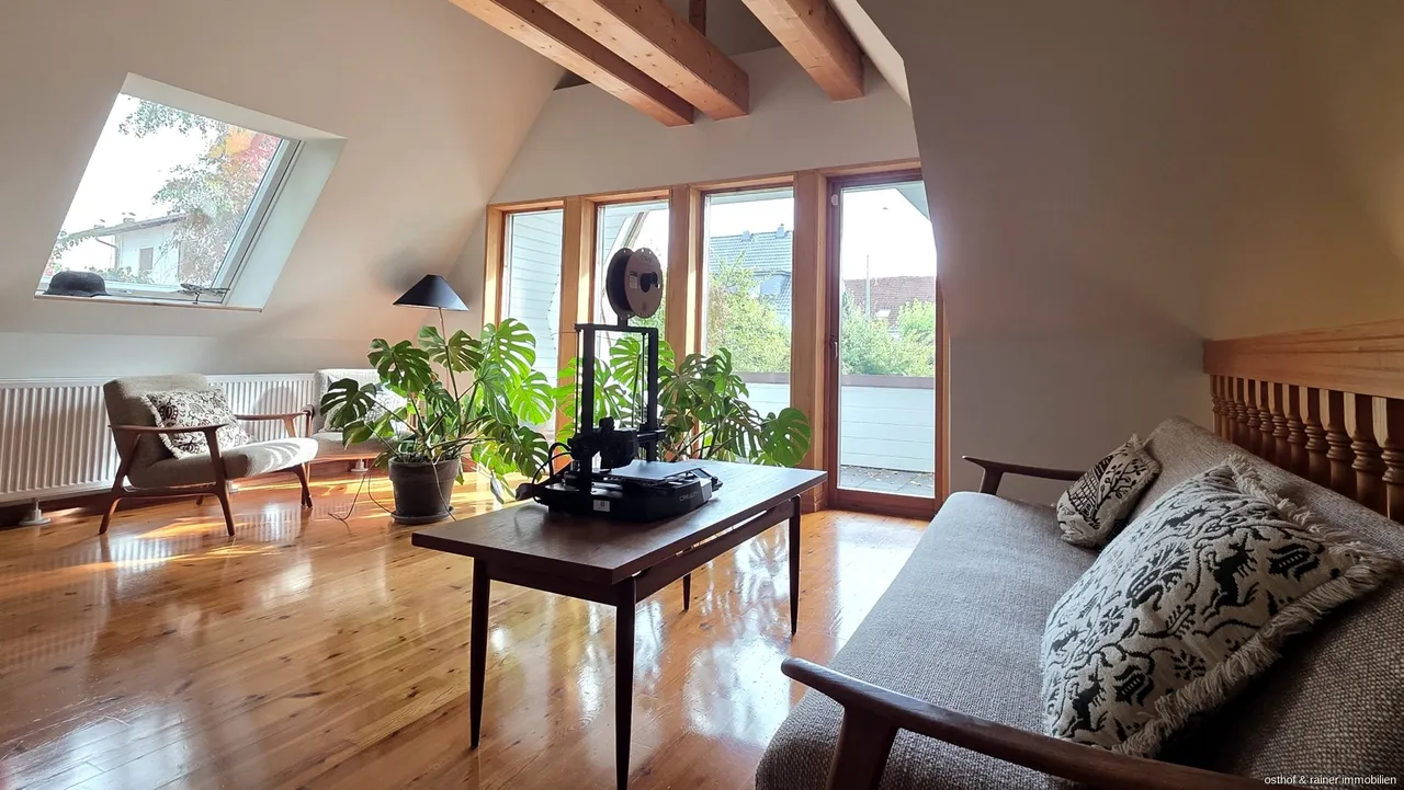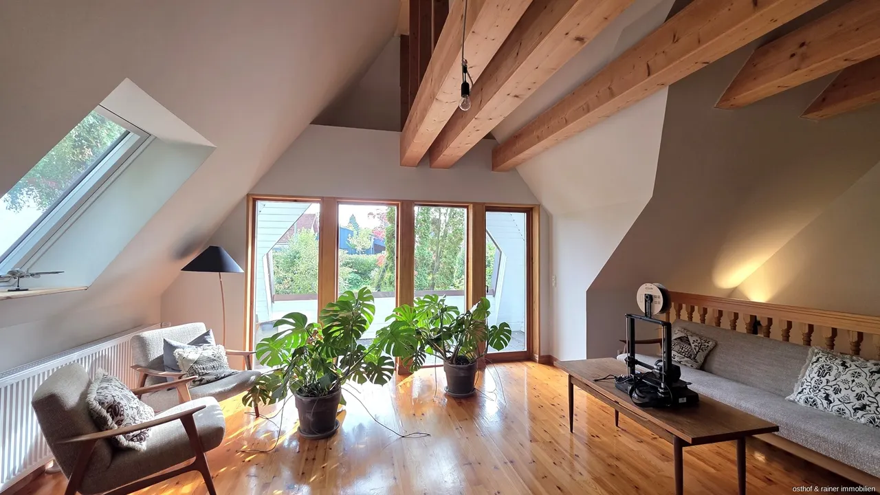Die klar strukturierten Grundrisse lassen sich flexibel nutzen: etwa als Arbeitszimmer, Gästezimmer oder Hobbybereich. Im Dachgeschoss verleihen sichtbare Holzstrukturen und großzügige Deckenhöhen viel Wärme & Charme.